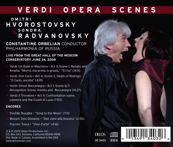 Un ballo in maschera (Ein Maskenball, Oper in 3 Akten) (Auszug) 01. "Morr¢, ma prima in grazia" Don Carlo (Don Carlos, Oper in 5 Akten) (Auszug) 02. "O Carlo, ascolta" Simone Boccanegra (Oper in 1 Prolog und 3 Akten) (Auszug) 03. "Recognition scene, Amelia and Boccanegra" Il Trovatore (Der Troubadour, Oper in 4 Akten) (Auszug) 04. "Confrontation scene, Leonora and the Count di Luna" Rusalka op. 114 (Oper in 3 Akten) (Auszug) 05. "Song to the moon" Don Giovanni KV 527 (Oper in 2 Akten) (Auszug) 06. "Deh vieni alla finestra" Tosca (Oper in 3 Akten) (Auszug) 07. "Vissi d'arte"