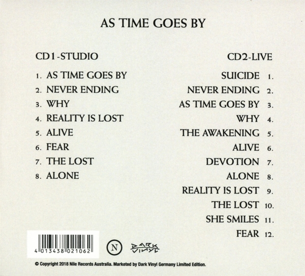 Disc 02 01. "Suicide" 02. "Never ending" 03. "As time goes by" 04. "Why" 05. "The awakening" 06. "Alive" 07. "Devotion" 08. "Alone" 09. "Reality is lost" 10. "The lost" 11. "She smiles" 12. "Fear" 13. "Keine Titelinformation [Set 2 Track 13 from "AS TIME GOES BY (REMIXED & REMASTERED)"]" 14. "Keine Titelinformation [Set 2 Track 14 from "AS TIME GOES BY (REMIXED & REMASTERED)"]" 15. "Keine Titelinformation [Set 2 Track 15 from "AS TIME GOES BY (REMIXED & REMASTERED)"]" 16. "Keine Titelinformation [Set 2 Track 16 from "AS TIME GOES BY (REMIXED & REMASTERED)"]" 17. "Keine Titelinformation [Set 2 Track 17 from "AS TIME GOES BY (REMIXED & REMASTERED)"]" 18. "Keine Titelinformation [Set 2 Track 18 from "AS TIME GOES BY (REMIXED & REMASTERED)"]"
