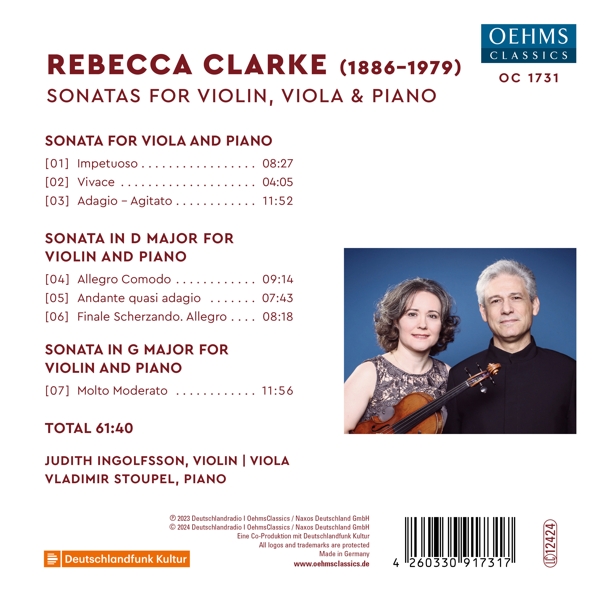 Born in London in 1886, violinist/violist Rebecca Clarke was also a composer who produced a significant number of works; her songs and chamber music were particularly notable. Although her output became neglected after the Second World War, it experienced a renaissance in the 1970s. The performances on this album take the listener on a journey through the eloquence and profundity of Rebecca Clarke's creative world. This is OehmsClassics' second album featuring Judith Ingolfsson (violin, viola) and Vladimir Stoupel (piano), furthering the label's commitment to presenting musical discoveries., Runningtime: 00:00:00, Labelcode OEHM1731C.2