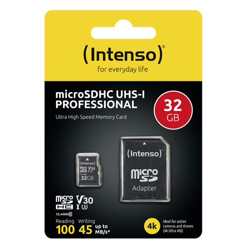 "microSD-Card UHS-I Professional 32GB Speicherkarte" von Intenso aus der Kategorie Speicherkarten es hat den internen Speichertyp UHS, ist BREITE breit, HÖHE hoch und 11 mm tief, hat die Farbe Schwarz und ist 1 g schwer.