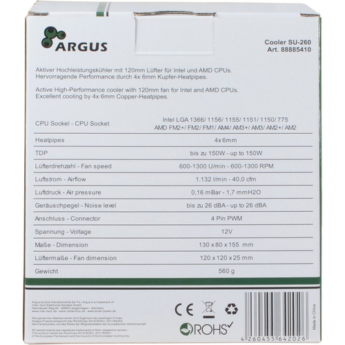 | Beschreibung: | Dieser massive Desktop-Kühler, mit laufruhigem 120mm Lüfter, sorgt bis zu einer TDP von 150W für zuverlässige Kühlung Ihrer CPU. Der SU-260 ist kompatibel zu zahlreichen Intel®- und AMD®-Sockeln. Dank vorinstallierter Montageklemmen für AMD® sowie Zubehör für Intel® passt er auf die aktuellen Plattformen und lässt sich schnell montieren. 42 ALU-Finnen und 4 doppelseitige 6mm Kupfer-Heatpipes ermöglichen eine ausgezeichnete Kühlleistung. Der 120mm Lüfter mit 4Pin PWM-Anschluss lässt sich zudem temperaturabhängig regeln. Mit maximal 26,0dbA bleibt er dabei flüsterleise. Seine Bauhöhe von 155mm prädestiniert ihn für den Einsatz in größeren Gehäusen. Seine Heatpipes aus Kupfer gewährleisten eine optimale Wärmeabfuhr und sorgen für eine ausgezeichnete Kühlleistung. Der orangene Lüfter mit optimierter Flügelstellung sorgt nicht nur optisch für Frische. einfache Montage auf AMD® und Intel® CPUs vier doppelseitige 6mm Heatpipes 120mm Lüfter mit 4Pin PWM-Anschluss TDP von bis zu 150W Hauptmerkmale-600 bis 1.400 U/min-26 dB-1150, 1151, 1155, 1156, 1366, AM2, AM2+, AM3, AM3+, FM1, FM2, AM4, 1200-CPU-Kühler mit LüfterManufacturer-Nr.: 88885410Der Inter-Tech Kühler ARGUS SU-260 mit aktivem 120-mm-Lüfter ist eine leistungsstarke und zuverlässige Kühllösung für moderne PC-Systeme. Mit vier effizienten Heatpipes und einem großen Aluminiumkühlkörper sorgt dieser CPU-Kühler auch bei hoher Belastung für optimale Wärmeabfuhr. Der beiliegende 120-mm-PWM-Lüfter arbeitet leise und liefert dennoch einen starken Luftstrom ? perfekt geeignet sowohl für Gaming-PCs als auch Arbeitsstationen mit hohen Leistungsanforderungen. Dank breiter Kompatibilität zu vielen Intel- und AMD-Sockeln sowie eines benutzerfreundlichen Montagesystems gestaltet sich die Installation besonders einfach. Der Hersteller Inter Tech steht seit Jahren für innovative Computerkomponenten mit hoher Qualität zu fairen Preisen und legt Wert auf Nachhaltigkeit: So werden beispielsweise recycelbare Verpackungsmaterialien verwendet und Produktionsprozesse umweltbewusst optimiert. Mit dem Kauf des ARGUS SU-260 leisten Kunden nicht nur ihrem System etwas Gutes, sondern tragen gleichzeitig zum Umweltschutz bei. |  | | Herstellernummer: |