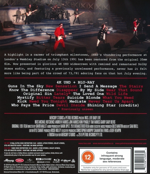 Beschreibung:A highlight in a career of triumphant milestones, INXS's thundering performance at London's Wembley Stadium on July 13th1991 has been restored from the original 35mm film. Presented here in glorious 4K Ultra High Definition widescreen at over 20 times the resolution of the original release. With remixed and remastered Dolby Atmos audio, and featuring a previously unreleased performance, never has it felt more like being part of the crowd of 73,791 adoring fans on that hot July evening. The classic 1991 performance, completely restored, remixed and remastered. This package also contains a standard Blu-ray. 4K UHD discs will not play on standard Blu-ray players. RUN TIME: 98 Minutes, Runningtime: 00:00:00, Labelcode 0845893