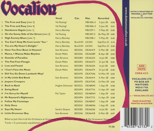 01. Harris, Jack & His Orchestra "The free and easy (Take 3)" 02. Harris, Jack & His Orchestra "The free and easy (Take 4)" 03. Harris, Jack & His Orchestra / Bentley, Harry "Handsome gigolo (Take 1)" 04. Harris, Jack & His Orchestra / Rosing, Val "On the sunny side of the street (Take 2)" 05. Harris, Jack & His Orchestra / Bentley, Harry "High society blues (Take 1)" 06. Harris, Jack & His Orchestra / Bentley, Harry "You can't stop me from lovin' you" 07. Harris, Jack & His Orchestra / Bentley, Harry "You are my heart's delight" 08. Harris, Jack & His Orchestra / Browne, Sam "Have you ever been in Heaven?" 09. Harris, Jack & His Orchestra / Miller, Dinah "Mama, I wanna make rhythm" 10. Harris, Jack & His Orchestra / Browne, Sam "Outside of Paradise" 11. Harris, Jack & His Orchestra / Miller, Dinah "The flat foot floogie" 12. Harris, Jack & His Orchestra / Browne, Sam "Lost and found" 13. Harris, Jack & His Orchestra / Miller, Dinah "I can't face the music" 14. Harris, Jack & His Orchestra "Did you go down Lambeth Way?" 15. Harris, Jack & His Orchestra / Browne, Sam "In my little red book" 16. Harris, Jack & His Orchestra "Jeepers creepers" 17. Harris, Jack & His Orchestra / Diamond, Hughie "Back to back" 18. Harris, Jack & His Orchestra "Swing band" 19. Harris, Jack & His Orchestra / Taylor, Pat "I'm sorry for myself" 20. Harris, Jack & His Orchestra "Mr Reynard's nightmare" 21. Harris, Jack & His Orchestra "Follow my footsteps" 22. Harris, Jack & His Orchestra "Only once" 23. Harris, Jack & His Orchestra / Shayne, Sandra "Says my heart" 24. Harris, Jack & His Orchestra / Browne, Sam "Little drummer boy"