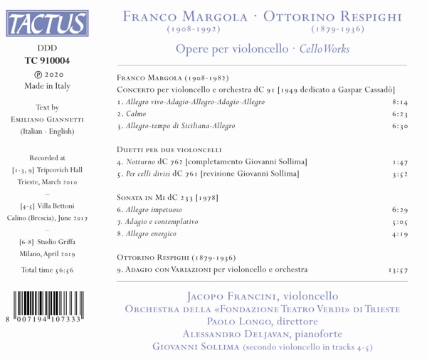 Konzert für Violoncello und Orchester dC 91 (1949) (Gaspar Cassad? gewidmet) 01. Francini, Jacopo "1. Allegro vivo - Adagio - Allegro - Adagio - Allegro" 02. Francini, Jacopo "2. Calmo" 03. Francini, Jacopo "3. Allegro - Tempo di siciliana - Allegro" 04. Sollima, Giovanni "Notturno für 2 Violoncelli dC 762 (vervollst. von Giovanni Sollima)" 05. Sollima, Giovanni "Per celli divisi dC 761 (für 2 Violoncelli) (rev. von Giovanni Sollima)" Sonate für Violoncello und Klavier E-Dur dC 233 (1978) 06. Francini, Jacopo "1. Allegro impetuoso" 07. Francini, Jacopo "2. Adagio e contemplativo" 08. Francini, Jacopo "3. Allegro energico" 09. Francini, Jacopo "Adagio mit Variationen (für Violoncello und Orchester)"