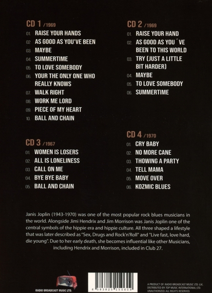 : 1969 () 1-1: Raise Your Hands (Raise Your Hand) (4:47) 1-2: As Good As You've Been To This World (2:43) 1-3: Maybe (3:39) 1-4: Summertime (4:35) 1-5: To Love Somebody (6:24) 1-6: Your The Only One Who Really Knows (You're The Only One Who Really Knows) (4:08) 1-7: Walk Right (3:43) 1-8: Work Me Lord (7:36) 1-9: Piece Of My Heart (3:44) 1-10: Ball And Chain (7:05) : 1969 () 2-1: Raise Your Hands (Raise Your Hand) (4:49) 2-2: As Good As You've Been To This World (6:29) 2-3: Try (Just A Little Bit Harder) (5:55) 2-4: Maybe (3:32) 2-5: To Love Somebody (4:58) 2-6: Summertime (4:24) : 1967 () 3-1: Women Is Losers (4:57) 3-2: All Is Loneliness (8:45) 3-3: Call On Me (3:21) 3-4: Bye Bye Baby (4:09) 3-5: Ball And Chain (10:11) : 1970 () 4-1: Cry Baby (5:57) 4-2: No More Cane (4:44) 4-3: Thowing A Party (Throwing A Party) (2:05) 4-4: Tell Mama (6:04) 4-5: Move Over (8:41) 4-6: Kozmic Blues (4:56)