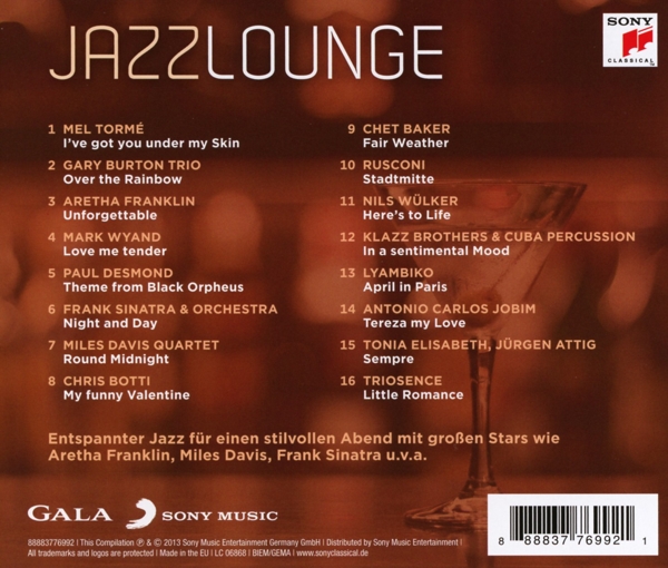 01. Torm?, Mel "I've Got You Under My Skin" 02. Burton, Gary Trio "Over The Rainbow (Remastered)" 03. Franklin, Aretha "Unforgettable" 04. Wyand, Mark "Love Me Tender" 05. Desmond, Paul "Theme From Black Orpheus (Live)" 06. Sinatra, Frank "Night And Day (Remastered)" 07. Davis, Miles "'Round Midnight" 08. Botti, Chris "My Funny Valentine" 09. Baker, Chet "Fair Weather" 10. Rusconi "Stadtmitte" 11. Wülker, Nils "Here's To Life" 12. Klazz Brothers & Cuba Percussion "In a Sentimental Mood" 13. Lyambiko "April In Paris" 14. Jobim, Antonio Carlos "Tereza My Love" 15. Attig, Jürgen "Sempre" 16. Triosence "Little Romance"