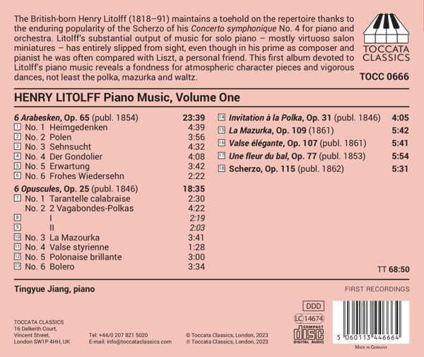| Beschreibung: | The British-born Henry Litolff (1818-91) maintains a toehold on the repertoire thanks to the enduring popularity of the Scherzo of his Concerto symphonique No. 4 for piano and orchestra. Litolff's substantial output of music for solo piano - mostly virtuoso salon miniatures - has entirely slipped from sight, even though in his prime as composer and pianist he was often compared with Liszt, a personal friend. This first album devoted to Litolff's piano music reveals a fondness for atmospheric character pieces and vigorous dances, not least the polka, mazurka and waltz., Runningtime: 00:00:00, Labelcode TCCT666.2 |