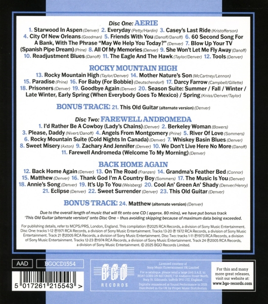 Beschreibung:Die CD "Aerie/Rocky Mountain High/Back Home Again" vereint drei der beliebtesten Alben von John Denver und präsentiert den einzigartigen Mix aus Folk- und Country-Musik des Singer-Songwriters. Diese Sammlung enthält zeitlose Klassiker wie ?Rocky Mountain High?, ?Sunshine on My Shoulders? und ?Back Home Again? ? Lieder voller Gefühl für Naturverbundenheit, Liebe und Heimat. Herausgegeben vom renommierten Label BEAT GOES, das für hochwertige Neuauflagen klassischer Aufnahmen bekannt ist, eignet sich dieses Set sowohl für langjährige Fans als auch für neue Hörerinnen und Hörer auf der Suche nach authentischer Musik mit Herz. John Denver war einer der erfolgreichsten amerikanischen Künstler der 1970er Jahre mit zahlreichen Chart-Hits; seine sanfte Stimme und sein Engagement für Umweltschutz machten ihn zu einer Ikone der Popmusik.