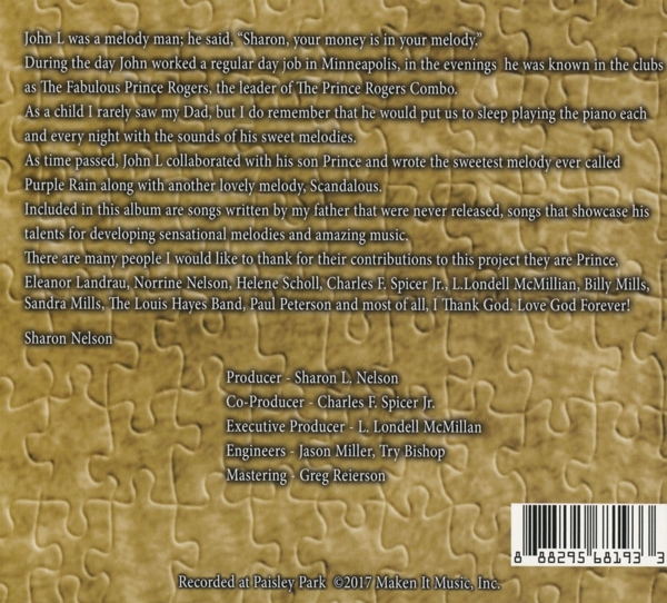 | | Beschreibung: | Co-producer: Charles F. Spicer Jr., Engineer [Engineers]: Jason Miller (16), Engineer [Engineers]: Try Bishop, Executive-Producer: L. Londell McMillan, Liner Notes: Sharon Nelson, Mastered By: Greg Reierson, Musician [Musicians], Bass: Dezron Douglas, Musician [Musicians], Drums: Louis Hayes, Musician [Musicians], Piano: Richard Germanson, Musician [Musicians], Saxophone: Vincent Herring, Musician [Musicians], Trumpet: Jeremy Pelt, Producer: Sharon Nelson, Written-By [Written By My Father]: John L. Nelson, Conductor, Orchestrated By [String Orchestration]: Adi Yeshaya, Strings [String Quartet], Cello: Rebecca Arons, Strings [String Quartet], Viola: Susan Janda, Strings [String Quartet], Violin: Allison Ostrander, Strings [String Quartet], Violin: Jill Olson-Moser, Labelcode MKIM397.2 (RAD-397), Copyright (c) Maken It Music, Inc., Recorded At Paisley Park Studios, Manufactured By Disc Makers |  | | Anzahl der Titel: |