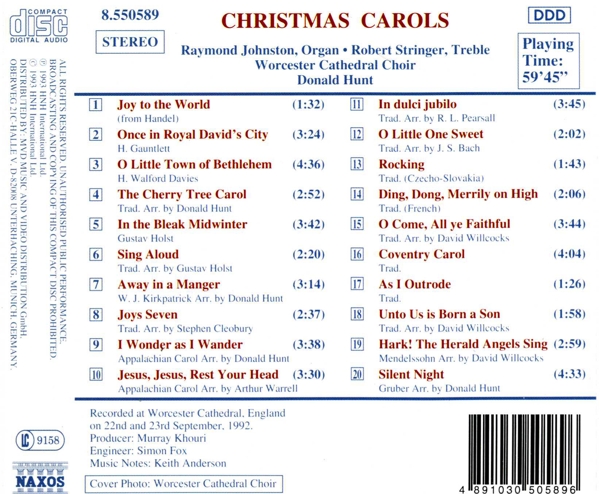 | Beschreibung: | Runningtime: 00:00:00, Choir: Choir Of Worcester Cathedral, Conductor: Donald Hunt, Engineer: Simon Fox (7), Liner Notes: Keith Anderson (6), Organ: Raymond Johnston (4), Producer: Murray Khouri, Treble Vocals: Robert Stringer (3), Written-By: Georg Friedrich Händel, Written-By: Henry J. Gauntlett, Written-By: H. Walford Davies, Arranged By: Donald Hunt, Written-By: Traditional, Written-By: Gustav Holst, Arranged By: Gustav Holst, Written-By: Traditional, Arranged By: Donald Hunt, Written-By: William J. Kirkpatrick, Arranged By: Stephen Cleobury, Written-By: Traditional, Arranged By: Donald Hunt, Written-By [Appalachian Carol]: Folk, Arranged By: Arthur Warrell, Written-By [Appalachian Carol]: Folk, Arranged By: Robert Lucas de Pearsall, Written-By: Traditional, Arranged By: Johann Sebastian Bach, Written-By: Traditional, Written-By [Checho-Slovak]: Traditional, Written-By [French]: Traditional, Arranged By: David Willcocks, Written-By: Traditional, Written-By: Traditional, Written-By: Traditional, Arranged By: David Willcocks, Written-By: Traditional, Arranged By: David Willcocks, Written-By: Felix Mendelssohn-Bartholdy, Arranged By: Donald Hunt, Written-By: Franz Gruber, Labelcode IMT953191.2 (8.550589), Recorded At Worcester Cathedral, Phonographic Copyright (p) HNH International Ltd., Copyright (c) HNH International Ltd., Manufactured By Sonopress, Distributed By MVD Music And Video Distribution GmbH |
