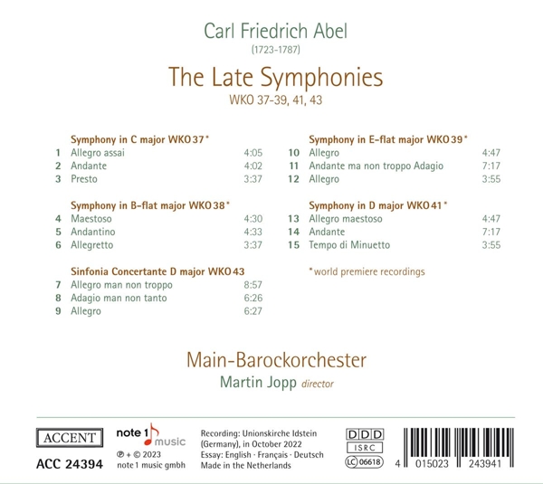 Beschreibung:Carl Friedrich Abel (1723-1787) has his place in music history above all as the last great virtuoso of the time-honoured viola da gamba and as the organiser of the so-called Bach-Abel concerts in London; which marked the beginning of modern public subscription concerts. What is less well known is that Abel not only performed there as a soloist; but also enriched the concerts with a large number of his own orchestral works. A total of 46 symphonies by him have survived; 40 of which appeared in print during his lifetime. Six - five "real" symphonies and one Sinfonia Concertante for oboe; violin and violoncello - were not printed during his lifetime; they have been preserved in manuscript in the Royal Court Library in Berlin. Abel had them in his luggage on his last visit to Germany in 1782 and apparently presented them in Berlin to the Prussian heir to the throne; Friedrich Wilhelm. On the occasion of Abel's 300th birthday; the Main Baroque Orchestra; conducted by Martin Jopp; presents four of these symphonies (WKO 37; 38; 39; 41) as world premiere recordings as well as the Sinfonia Concertante on this recording., Runningtime: 00:00:00, Labelcode ACR24394C.2