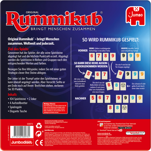 | | Beschreibung: | O-Titel: Jumbo 03973 Original Rummikub in MetalldTyp/Warengruppe: FAMILIEN UND GESELLHersteller-Nr.: 03973Genre/Unterkategorie: Rummy, Jumbo Spiele, GesellschaftsspieleGewicht: 1322 gAbmasse: 27x27x7 cmAltersempfehlung ab: 7 Jahr(e)Altersempfehlung bis: 99 Jahr(e)Altersfreigabe: 3 Jahr(e)Spieleranzahl: 2 bis 4Spieldauer: 20 min.Beschreibung: Einer der weltweit meistverkauften Spiele-Klassiker. Seit 30 Jahren fasziniert dieses Zahlen-Ablegespiel Jung und Alt. Jetzt in deko rativer Metallverpackung. Mit hochwertigen Spielsteinen und Aufstellbrettern in neuem Design. Für 2-4 Spieler. Ab 6 Jahren.Zusatzbeschreibung: RUMMIKUB Premium in der attraktiven Blech-Verpackung, mit hochwertigen Spielsteinen und Aufstellbrettern in neuem Design. Für 24 Sp ieler. Ab 6 Jahren.Warnhinweis: Einer der weltweit meistverkauften Spiele-Klassiker. Seit 30 Jahren fasziniert dieses Zahlen-Ablegespiel Jung und Alt. Jetzt in deko rativer Metallverpackung. Mit hochwertigen Spielsteinen und Aufstellbrettern in neuem Design. Für 2-4 Spieler. Ab 6 Jahren.Sprache Gebrauchsanleitung: DEBatterie erforderlich: NeinGrüner Punkt: JaKennzeichen ICTI Care / BCSI: NeinCE Kennzeichnung: JaCE Richtlinie: 2009/48/EUHerkunft: ILHersteller: Jumbo Spiele GmbH-20 Minuten-ab 7 Jahren-Rummikub-2 - 4 SpielerManufacturer-Nr.: 03973RUMMIKUB Premium in der attraktiven Blech-Verpackung, mit hochwertigen Spielsteinen und Aufstellbrettern in neuem Design. Handlich, praktisch, ausgezeichnet. Für alle, die auch auf Reisen nicht auf den absoluten Rummikub-Spielespaß verzichten wollen.Inhalt: 104 Spielsteine, 4 Aufstellbretter, 2 Joker, SpielregelnErleben Sie den zeitlosen Spielspaß des Original Rummikub in einer stilvollen Metalldose von Jumbo Spiele GmbH. Dieses klassische Familienspiel vereint Strategie und Glück: Ziel ist es, mit hochwertigen Spielsteinen Zahlenreihen und -gruppen zu bilden. Das Set enthält 106 langlebige Steine (Nummern 1?13 in vier Farben sowie Joker), vier stabile Aufstellbretter und eine leicht verständliche Anleitung ? alles sicher verstaut in einer robusten Metallbox für einfachen Transport und optimalen Schutz. Geeignet für 2?4 Spieler ab sieben Jahren eignet sich Rummikub ideal für Familienabende oder gesellige Spielrunden unter Freunden. Der Hersteller Jumbo Spiele GmbH steht seit Jahrzehnten für Qualität, Sicherheit und Nachhaltigkeit; bei der Produktion werden umweltfreundliche Materialien verwendet und auf verantwortungsvolle Beschaffung geachtet. Mit dem Kauf dieses Produkts unterstützen Sie nachhaltige Herstellungsverfahren ? ein Beitrag zum Umweltschutz und gleichzeitig stundenlanger Spielspaß! |  | | Mindestalter: |