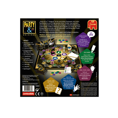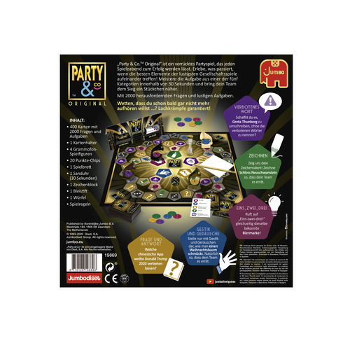Beschreibung:Party und Co Original ist ein verrücktes Partyspiel, das jeden Spieleabend zum Erfolg werden lässt! Es erscheint zum 30-jährigen Jubiläum in einem neuen Design! Die besten Elemente der lustigsten Gesellschaftsspiele werden in diesem Spiel kombiniert. Ab 14 Jahren für 3 - 20 Spieler.