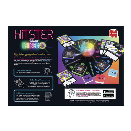 | | Beschreibung: | O-Titel: Hitster BingoTyp/Warengruppe: FAMILIEN UND GESELLHersteller-Nr.: 1110100383Genre/Unterkategorie: Partyspiele, Jumbo Spiele, ErwachsenenspieleGewicht: 900 gAbmasse: 30x21x8 cmAltersempfehlung ab: 16 Jahr(e)Altersempfehlung bis: 99 Jahr(e)Altersfreigabe: 3 Jahr(e)Spieleranzahl: 2 bis 10Spieldauer: 30 min.Beschreibung: Macht euch bereit, die Discokugel zu drehen und zu den Beats in ''Hitster Bingo'' zu tanzen! Mithilfe der Discokugel wird die Kategorie ermittelt, dann scannt ihr die Karte und lasst die Musik spielen. Erratet das Jahrzehnt, erkennt die Sänger oder Bands, legt euch auf das exakte Jahr fest beziehungsweise gebt an, ob der Song vor oder nach den 2000er- Jahren rausgekommen ist. Wer als Erster eine Reihe oder Spalte mit den vier verschiedenen Kategorien vervollständigt, wird zum ''Hitster Bingo''-Champion gekrönt!Warnhinweis: Macht euch bereit, die Discokugel zu drehen und zu den Beats in ''Hitster Bingo'' zu tanzen! Mithilfe der Discokugel wird die Kategorie ermittelt, dann scannt ihr die Karte und lasst die Musik spielen. Erratet das Jahrzehnt, erkennt die Sänger oder Bands, legt euch auf das exakte Jahr fest beziehungsweise gebt an, ob der Song vor oder nach den 2000er- Jahren rausgekommen ist. Wer als Erster eine Reihe oder Spalte mit den vier verschiedenen Kategorien vervollständigt, wird zum ''Hitster Bingo''-Champion gekrönt!Sprache Gebrauchsanleitung: DEBatterie erforderlich: NeinHerkunft: CNHersteller: Jumbo Spiele GmbH |  | | Mindestalter: |