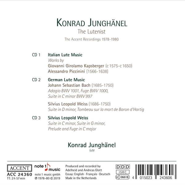 Beschreibung:Today Konrad Junghänel - with his ensemble Cantus Coelln and as guest conductors in opera houses - is one of the leading conductors in the field of early music. The present 3-release set recalls the beginning of his career when he was internationally in demand and celebrated as a solo lutenist. The three recordings of lute music from Italy and Germany, which Konrad Junghänel recorded for the Belgian label Accent in the late 1970s, are collected here. He was awarded international prizes for his recordings of the lute works of Johann Sebastian Bach and the solo works of Silvius Leopold Weiss. The present album features the works of Bach, Piccinini, Kapsberger, and Weiss., Runningtime: 00:00:00, Labelcode ACR24360.2