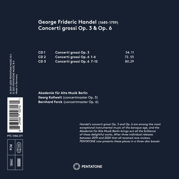 Beschreibung: | Handel's concerti grossi Op. 3 and Op. 6 are among the most exceptional instrumental music of the baroque age, and the Akademie für Alte Musik Berlin brings out all the brilliance of these delightful works. After three individual releases between 2019 and 2020 that all received rave reviews, PENTATONE now presents these pieces in a three-disc boxset. With their historically-informed and lively playing, the Akademie für Alte Musik Berlin and concertmasters Georg Kallweit (Op.3) and Bernhard Forck (Op. 6) demonstrate why many consider them the best baroque ensemble of today. The Akademie für Alte Musik Berlin presented acclaimed recordings of Telemann's Miriways and Handel's Messiah in 2020. Their 2019 recording of the first six Handel Op. 6 concerti grossi was hailed as "immaculately played... free of fashionable eccentricities" by The Sunday Times, while Klassik praised the ensemble's playing as "eloquent". Their following release with the remainder of the Op. 6 concertos (2020) was singled out by Music Web International for it's unprecedented "lightness" and "brightness", while BBC Music Magazine concluded that the Op. 3 recording "deserves a place in the hall of fame". The ensemble's first PENTATONE album, Cantata (2018) with countertenor Bejun Mehta, won a Diapason d'or., Runningtime: 00:00:00, Labelcode PNTA5186271.2 |