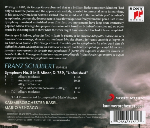 Beschreibung:Composed By: Franz Schubert, Conductor: Mario Venzago, Design: Christine Schweitzer, Engineer [Sound]: Jakob Händel, Orchestra: Kammerorchester Basel, Photography By [Kammerorchester Basel]: Heike Kandalowski, Photography By [Mario Venzago]: Alberto Venzago, Producer [Recording], Edited By: Andreas Werner (4), Labelcode IMT5431382.2 (88985431382), Phonographic Copyright (p) Sony Music Entertainment Switzerland GmbH, Copyright (c) Sony Music Entertainment Switzerland GmbH, Copyright (c) Heike Kandalowski, Copyright (c) Alberto Venzago, Copyright (c) Mario Venzago, Recorded At Casino Basel Musiksaal, Glass Mastered At Sony DADC, Distributed By Sony Music Switzerland GmbH