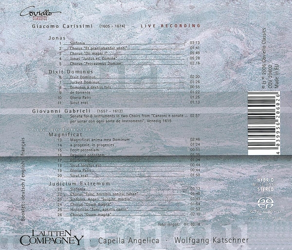 Beschreibung:Alto Vocals [Choir]: Alexander Schneider (2), Alto Vocals [Choir]: David Erler, Alto Vocals [Choir]: Matthias Lucht, Alto Vocals [Choir]: Thomas Riede, Art Direction: Regina Eimler, Bass Vocals [Choir]: Kai-Uwe Fahnert, Bass Vocals [Choir]: Matthias Gerchen, Bass Vocals [Choir]: Matthias Lutze, Bass Vocals, Solo Vocal: Matthias Gerchen, Bass Vocals, Solo Vocal: Matthias Lutze, Booklet Editor: Thomas Jakobi, Choir: Capella Angelica, Composed By: Giacomo Carissimi, Directed By: Wolfgang Katschner, Double Bass: Annette Rheinfurth, Dulcian: Adrian Rovatkay, Edited By: Udo Potratz, Ensemble: Lautten Compagney, Harp: Johanna Seitz, Harpsichord, Organ: Christine Tschirge, Harpsichord, Organ: Mark Nordstrand, Liner Notes: Erik Dremel, Liner Notes [Translation]: Frédéric Comtet, Liner Notes [Translation]: Jan Creutz, Liner Notes [Translation]: Teresa Calvelli-Adorno, Photography By: Matthias Knoch, Producer: Moritz Bergfeld, Producer: Olaf Mielke, Soprano Vocals [Choir]: Barbara Christina Steude, Soprano Vocals [Choir]: Christine Oswald, Soprano Vocals [Choir]: Doerthe Maria Sandmann, Soprano Vocals [Choir]: Sabine Goetz, Soprano Vocals, Solo Vocal: Barbara Christina Steude, Soprano Vocals, Solo Vocal: Sabine Goetz, Tenor Vocals: Hermann Oswald, Tenor Vocals [Choir]: Christoph Burmester, Tenor Vocals [Choir]: Hermann Oswald, Tenor Vocals [Choir]: Michael Schaffrath, Tenor Vocals [Choir]: Volker Arndt, Theorbo: Hans-Werner Apel, Trombone: Christoph Homburg, Trombone: Detlef Reimers, Trombone: Yuji Fujimoto (2), Trumpet: Robert Vanryne, Trumpet: Thomas Friedländer, Viola: Caroline Kersten, Viola: Ulrike Paetz, Violin: Cathi Aglibut, Violin, Concertmistress: Brigitte Täubl, Violone: Ulrike Becker, Composed By: Giovanni Gabrieli, Labelcode COVC20602SACD (COV 20602), Phonographic Copyright (p) Coviello Classics, Copyright (c) Coviello Classics, Recorded At Dom zu Halle
