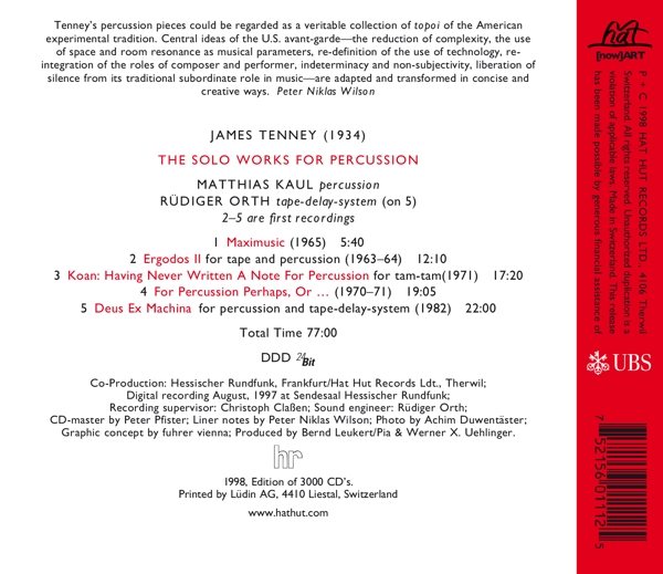 Beschreibung:Runningtime: 00:00:00, Co-producer [Co-Production]: Hat Hut Records, Ltd., Co-producer [Co-Production]: Hessischer Rundfunk, Composed By: James Tenney, Design [Graphic Concept]: fuhrer vienna, Engineer [Sound]: Rüdiger Orth, Liner Notes: Peter Niklas Wilson, Mastered By [CD-master]: Peter Pfister, Percussion: Matthias Kaul, Photography By: Achim Duwentäster, Producer [Produced By]: Bernd Leukert, Producer [Produced By]: Pia & Werner X. Uehlinger, Recording Supervisor: Christoph Claßen, Effects [Tape-delay-system]: Rüdiger Orth, Labelcode HAHT111.2 (hat[now]ART 111), Copyright (c) Hat Hut Records Ltd., Phonographic Copyright (p) Hat Hut Records Ltd., Printed By Lüdin AG, Recorded At Sendesaal Hessischer Rundfunk