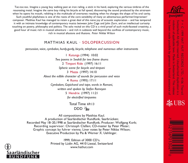 Beschreibung:Runningtime: 00:00:00, Composed By [All Compositions By]: Matthias Kaul, Design [Graphic Concept]: fuhrer vienna, Executive-Producer [Executive Production]: Pia & Werner X. Uehlinger, Liner Notes [Texts And Sub-texts, February 1999]: Peter Niklas Wilson, Mastered By [CD-master By]: Peter Pfister, Producer: Wolfgang Korb, Producer [A Production Of]: Saarländischer Rundfunk, Recording Supervisor: Christoph Claßen, Frame Drum [Two Frame Drums]: Matthias Kaul, Timpani, Performer [Bicycle]: Matthias Kaul, Percussion, Voice: Matthias Kaul, Cimbalom [Cymbalom], Strings [Gopichand], Tape: Matthias Kaul, Words By [Words Written By], Voice [Words Spoken By]: Stefan Romeyan, Timpani [Electrified Timpanies]: Matthias Kaul, Labelcode HAHT130.2 (hat[now]ART 130), Phonographic Copyright (p) Hat Hut Records Ltd., Copyright (c) Hat Hut Records Ltd., Recorded At Saarländischer Rundfunk, Printed By Lüdin AG