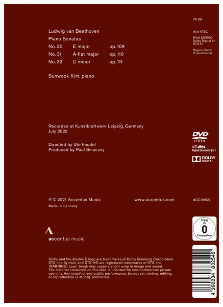 01. (keine Angaben) "Vorspann" Sonate für Klavier Nr. 30 E-Dur op. 109 02. Kim, Sunwook "1. Vivace ma non troppo - Adagio espressivo" 03. Kim, Sunwook "2. Prestissimo" 04. Kim, Sunwook "3. Gesangvoll, mit innigster Empfindung (Andante molto cantabile ed espressivo)" Sonate für Klavier Nr. 31 As-Dur op. 110 05. Kim, Sunwook "1. Moderato cantabile, molto espressivo" 06. Kim, Sunwook "2. Allegro molto" 07. Kim, Sunwook "3. Adagio ma non troppo - Fuge: Allegro ma non troppo" Sonate für Klavier Nr. 32 c-moll op. 111 08. Kim, Sunwook "1. Maestoso - Allegro con brio ed appassionato" 09. Kim, Sunwook "2. Arietta: Adagio molto semplice e cantabile" 10. (keine Angaben) "Abspann"