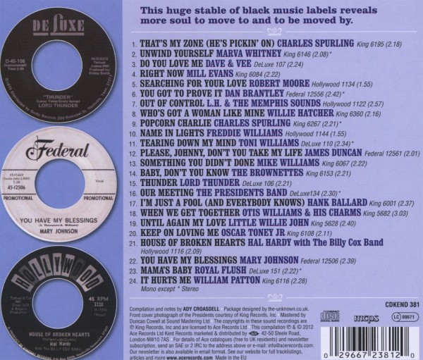 01. Spurling, Charles "That's My Zone (He's Pickin' On)" 02. Whitney, Marva "Unwind Yourself" 03. Dave & Vee "Do you love me" 04. Evans, Mill "Right now" 05. Moore, Robert "Searching for your love" 06. Brantley, Dan "You got to prove it" 07. L.H. / Memphis Sounds, The "Out of control" 08. Hatcher, Willie "Who's got a woman like mine" 09. Spurling, Charles "Popcorn Charlie" 10. Williams, Freddie "Name in lights" 11. Williams, Tony "Tearing down my mind" 12. Duncan, James "Please, Johnny, don't you take my life" 13. Williams, Mike "Something you didn't done" 14. Brownettes, The "Baby, don't you know" 15. Lord Thunder "Thunder" 16. Presidents Band, The "Our meeting" 17. Ballard, Hank "I'm just a foold (and everybody knows)" 18. Williams, Otis & His Charms "When we get together" 19. John, Little Willie "Until again my love" 20. Toney Jr, Oscar "Keep on loving me" 21. Hardy, Hal & The Billy Cox Band "House of broken hearts" 22. Johnson, Mary "You Have My Blessings" 23. Royal Flush "Mama's baby" 24. Patton, William "It hurts me"
