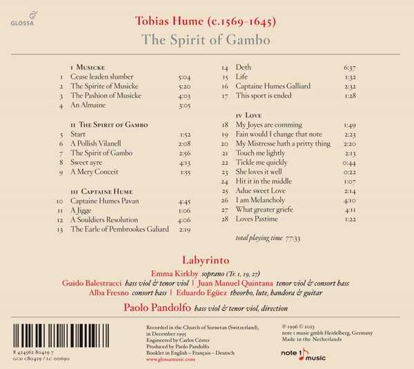 Captain Tobias Hume was not only a military man, but also an accomplished musician and composer. Emma Kirkby and Paolo Pandolfo prove that in former times active military personnel were also capable of outstanding artistic achievements."Emma Kirkby at the zenith of her artistic abilities, literature that seems tailor-made for her, and an unleashed instrumental ensemble under Paolo Pandolfo - this interpretation is simply exorbitantly good" (Toccata), Runningtime: 00:00:00, Labelcode GSA80419C.2