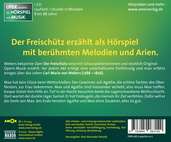 Der Freischütz op. 77 (Oper in 3 Akten) (Auszug) 01. CSR Symphony Orchestra "Ouvertüre 1" 02. Klemm, Matti "Einführung mit Matti Klemm" Der Freischütz op. 77 (Oper in 3 Akten) (Auszug) 03. CSR Symphony Orchestra "Ouvertüre 2" 04. Hof, Thomas "Einführung 1. Akt" Der Freischütz op. 77 (Oper in 3 Akten) (Auszug) 05. Ackermann, Otto "Victoria, der Meister soll leben" 06. Hof, Thomas "Szene: Max, Kuno, Kaspar, J?ger - Ach, wenn die Sonne" Der Freischütz op. 77 (Oper in 3 Akten) (Auszug) 07. Ackermann, Otto "Durch die W?lder, durch die Auen" 08. Hof, Thomas "Szene: Max, Kaspar - Irgendwas führt er im Schilde" Der Freischütz op. 77 (Oper in 3 Akten) (Auszug) 09. Ackermann, Otto "Schweig, schweig" 10. Hof, Thomas "Einführung 2. Akt" Der Freischütz op. 77 (Oper in 3 Akten) (Auszug) 11. Ackermann, Otto "Milch des Mondes fiel aufs Kraut..." 12. Hof, Thomas "Szene: Agathe - ?nnchen - Wie wenig konnte man..." Der Freischütz op. 77 (Oper in 3 Akten) (Auszug) 13. Ackermann, Otto "Wie nahte mir der Schlummer" 14. Hof, Thomas "Szene: Max, Kaspar - Agathe ahnt nicht..." Der Freischütz op. 77 (Oper in 3 Akten) (Auszug) 15. Ackermann, Otto "Durch Berg und Tal, durch Schlund und Schlacht" 16. Hof, Thomas "Einführung 3. Akt 1" Der Freischütz op. 77 (Oper in 3 Akten) (Auszug) 17. Ackermann, Otto "Und ob der Wolke sie verhüllte" 18. Hof, Thomas "Einführung 3. Akt 2" Der Freischütz op. 77 (Oper in 3 Akten) (Auszug) 19. Ackermann, Otto "Entre-Akte" 20. Hof, Thomas "Szene: Fürst, Kaspar, Max, Kuno, Agathe, J?ger, Pfarrer - Tja, vom Teufel..." Der Freischütz op. 77 (Oper in 3 Akten) (Auszug) 21. Ackermann, Otto "Die Zukunft..."