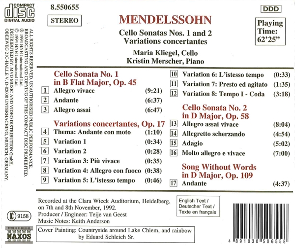Sonate für Violoncello und Klavier Nr. 1 B-Dur op. 45 01. "1. Allegro vivace" 02. "2. Andante" 03. "3. Allegro assai" Variationen op. 17 (Variations concertantes für Violoncello und Klavier) 04. "Thema: Andante con moto" 05. "Variation 1" 06. "Variation 2" 07. "Variation 3: Pi? vivace" 08. "Variation 4: Allegro con fuoco" 09. "Variation 5: L'istesso tempo" 10. "Variation 6: L'istesso tempo" 11. "Variation 7: Presto ed agitato" 12. "Variation 8: Tempo 1 - Coda" Sonate für Violoncello und Klavier Nr. 2 D-Dur op. 58 13. "1. Allegro assai vivace" 14. "2. Allegretto scherzando" 15. "3. Adagio" 16. "4. Molto allegro e vicace" 17. "Lied ohne Worte D-Dur op. 109 (für Violoncello und Klavier)"