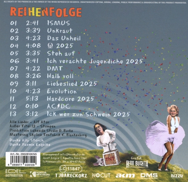 Beschreibung:?Weltherrschaft für alle!? ist eine CD der deutschen Band Knorkator und wird vom Hersteller KNORKATOR veröffentlicht. Das Album präsentiert die einzigartige Mischung aus Industrial Metal, Hard Rock und satirischen Texten ? ein Markenzeichen von Knorkator seit vielen Jahren. Die Songs überzeugen durch kraftvolle Gitarrenriffs, energiegeladene Rhythmen und einen unverwechselbaren Wortwitz mit Tiefgang und Humor gleichermaßen. Knorkator wurde 1994 in Berlin gegründet und ist bekannt für ihre spektakulären Live-Auftritte sowie ihren eigenwilligen Musikstil zwischen Heavy Metal und elektronischen Einflüssen gepaart mit ironisch-humorvollen Texten über gesellschaftliche Themen oder das Musikbusiness selbst. Mit Alben wie ?Ich bin der Boss? (2011) oder ?We Want Mohr? (2019) sowie Auftritten auf großen Festivals wie dem Wacken Open Air hat sich die Band eine treue Fangemeinde erspielt. Der Hersteller KNORKATOR steht nicht nur hinter dieser Veröffentlichung als Produzent: Er verkörpert auch den unabhängigen Geist der Band ? viele Werke erscheinen im Eigenverlag und garantieren so maximale künstlerische Freiheit abseits des Mainstreams.