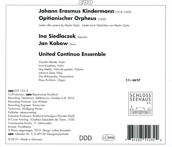 Opitianischer Orpheus (Lieder nach Gedichten von Martin Opitz) (Auszug) 01. Siedlaczek, Ina "Jetzund kommt die Nacht herbei" 02. Siedlaczek, Ina "O du kleiner nackter Schütze" 03. Siedlaczek, Ina "Allhier in dieser wüsten Heid" 04. Siedlaczek, Ina "Zehnte von den Pierinnen" Pars Prior (Auszug) 05. United Continuo Ensemble "Sonate Nr. 1 d-moll (für Violine und Basso continuo)" Opitianischer Orpheus (Lieder nach Gedichten von Martin Opitz) (Auszug) 06. Siedlaczek, Ina "Ich empfinde fast ein Grauen" 07. Siedlaczek, Ina "Wann sich der werte Gast, die Seele, nun soll scheiden" 08. Siedlaczek, Ina "O Wertest auf der Welt, o Sch?nest aller Sch?nen" Pars Posterior (Auszug) 09. United Continuo Ensemble "Sonate Nr. 2 g-moll (für Violine und Basso continuo)" Opitianischer Orpheus (Lieder nach Gedichten von Martin Opitz) (Auszug) 10. Siedlaczek, Ina "Hochzeitlied" 11. Siedlaczek, Ina "Als ich n?chst war ausspazieret" 12. Siedlaczek, Ina "Es hat der Jupiter" 13. Siedlaczek, Ina "Nachtklag" 14. Siedlaczek, Ina "Amandus und Amoena" 15. Siedlaczek, Ina "O wohl dem, der die rechte Zeit" 16. Siedlaczek, Ina "Ach Liebste, lass uns eilen" 17. Siedlaczek, Ina "Schwarz ist mein Farb" 18. Siedlaczek, Ina "Corydon sprach mit Verlangen" 19. Siedlaczek, Ina "Ist irgend zu erfragen ein Sch?fer um den Rhein" 20. Siedlaczek, Ina "Kommt, lasst uns ausspazieren"