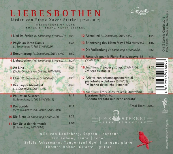 5. Sammlung, StWV 57/1 01. "Lied im Freien" 1. Sammlung, II. Teil, StWV 52/9 02. "Phylis an ihren Damis" 5. Sammlung, StWV 57/5 03. "Ermunterung" 16. Sammlung, StWV 69/1 04. "Liebesbothen" Sechs Gedichte von Goethe, StWV 70/1 05. "An Lina" 12. Sammlung, StWV 64/4 06. "Elisa" 15. Sammlung, StWV 67/1 07. "Des J?gers Abschied" 1. Sammlung II. Teil, StWV 70/4 08. "Philint an Suschen" Sechs Gedichte von Goethe, StWV 70/4 09. "Die Spr?de" 3. Sammlung, StWV 54/4 10. "Die Biene" 9. Sammlung, StWV 61/5 11. "Der Geist der Harmonie" 3. Sammlung, StWV 54/7 12. "Abendlied" StWV 80 13. "Erinnerung des 15ten May 1793" 4. Sammlung, StWV 56/6 14. "Die Vollendung" StWV 226 15. "Fantaisie pour le Piano-Forte, oeuvre 45" aus: 7 Lieder, StWV 110/5 16. ""Misero tu non sei"" Arietta con accompagnamento di pianoforte o chitarra StWV 29 17. ""M'hanno detto, che il marito"" aus: Trois Duos Italiens, Quatri?me Livraison StWV 11/3 18. ""Adonta del fato mio bene adorato""