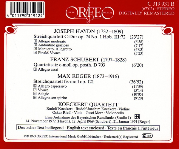 | Beschreibung: | Booklet Editor: Klaus Kalchschmid, Cover, Design: CC Schriefer, Engineer: Nadja Luko, Engineer: Uta van Reeken, Engineer: Werner Mälzig, Ensemble: Koeckert-Quartett, Liner Notes: Karl Schumann, Liner Notes [Traduction]: Anne De Waël, Photography By: Werner Neumeister, Photography By [Cover]: Gerd Pfeiffer, Recording Supervisor: Gerhard Uebele, Recording Supervisor: Helene Steffan, Remastered By: Ulrich Kraus, Viola [Koeckert Quartett]: Oskar Riedl, Violin [Koeckert Quartett]: Rudolf Joachim Koeckert, Violin [Koeckert Quartett]: Rudolf Koeckert, Violoncello [Koeckert Quartett]: Josef Merz, Composed By: Joseph Haydn, Composed By: Franz Schubert, Composed By: Max Reger, Labelcode OEO319931.2 (C 319931 B), Phonographic Copyright (p) ORFEO International Music GmbH, Copyright (c) ORFEO International Music GmbH, Recorded By Bayerischer Rundfunk, Recorded At Bayerischer Rundfunk, Studios München, Manufactured By P+O Pallas |