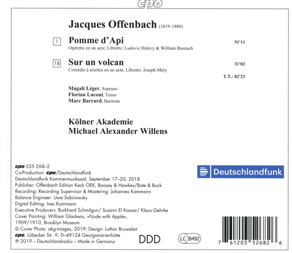| | Beschreibung: | An absolute highlight rounds off the Offenbach Year 2019: two one-act operettas presented in historical performance practice by renowned soloists and the Kölner Akademie on instruments from the epoch. Trafalgar sur un volcan is set in Dublin during the Napoleonic period, while the action of Pomme d'api, it too with it's love triangle, takes place in the household of the retiree Rabastens in Paris. He forces his nephew Gustave to renounce his beloved Catherine, nicknamed "Pomme d'Api" (Little Red Apple), a bride beneath his social class. Gustave pretends to agree to this arrangement, but a little later is surprised to find her as the unsuspecting Rabastens' new housekeeper. In other words, this too is a ménage à trois that will not last in the long run. Both works are full of witty arias, duets, and trios and rise to the absolute heights of Offenbach's melodic genius, which is magnificently revealed in his brilliant instrumentations!, Runningtime: 00:00:00, Baritone Vocals: Marc Barrard, Co-producer: Deutschlandfunk, Co-producer: cpo, Conductor: Michael Willens, Design: Lothar Bruweleit, Edited By [Digital Editing]: Ines Kammann, Engineer [Balance Engineer]: Uwe Sabirowsky, Executive-Producer [Executive Producers]: Burkhard Schmilgun, Executive-Producer [Executive Producers]: Klaus Gehrke (2), Executive-Producer [Executive Producers]: Susann El Kassar, Liner Notes: Jean-Christophe Keck, Liner Notes [Translated By]: Susan Marie Praeder, Liner Notes [Übersetzung]: Frank Harders-Wuthenow, Orchestra: Kölner Akademie, Painting [Cover Painting]: William James Glackens, Recording Supervisor, Mastered By [Mastering]: Johannes Kammann, Soprano Vocals: Magali Léger, Tenor Vocals: Florian Laconi, Composed By: Jacques Offenbach, Libretto By [Libretto Von]: Ludovic Halévy, Libretto By [Libretto Von]: William Busnach, Composed By: Jacques Offenbach, Libretto By [Libretto Von]: Joseph Méry, Written-By: Ernest L'Épine, Labelcode CPO555268.2 (555 268-2), Record Company Classic Produktion Osnabrück, Phonographic Copyright (p) cpo, Copyright (c) Archiv Von Jean-Christophe Keck, Copyright (c) akg-images, Published By Offenbach Edition Keck OEK, Published By Boosey & Hawkes, Published By Bote & Bock, Recorded At Deutschlandfunk Sendesaal, Glass Mastered At Arvato |  | | Herstellernummer: |