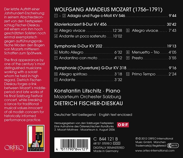 Beschreibung: | Booklet Editor: Christiane Delank, Booklet Editor: Sebastian Stauss, Composed By: Wolfgang Amadeus Mozart, Conductor: Dietrich Fischer-Dieskau, Cover, Design: Atelier Langenfass, Engineer [Tonassistenten]: Boris Injak, Engineer [Tonassistenten]: Tobias Gottsmann, Engineer [Tonmeister]: Edwin Pfanzagl, Liner Notes [Translated Into English]: Stewart Spencer, Liner Notes, Supervised By: Gottfried Kraus, Mastered By: Ton Eichinger, Orchestra: Das Mozarteum Orchester Salzburg, Photography By: Adam Shemper, Photography By: Felix Broede, Piano: Konstantin Lifschitz, Labelcode OEO844121.2 (C 844 121 B), Recorded By ORF, Recorded At Mozarteum, Salzburg, Phonographic Copyright (p) ORFEO International Music GmbH, Copyright (c) ORFEO International Music GmbH |