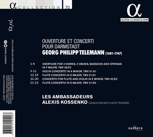 Ouverture for 2 horns, 2 oboes, bassoon and strings in F major, TWV 55:F3 01. "Ouverture" 02. "Rondeau" 03. "Sarabande" 04. "Menuet - Trio pour les Hautbois" 05. "La Badinerie" 06. "Gigue" 07. "R?jouissance - Trio pour les Hautbois" 08. "Fanfare" Violin Concerto in A minor, TWV 51:A1 09. "Adagio" 10. "Allegro - Adagio" 11. "Presto" Flute Concerto in D major, TWV 51:D1 12. "Andante" 13. "Vivace" 14. "Largo" 15. "Allegro" Concerto for flute and violin in E minor, TWV 52:E3 16. "[...]" 17. "Adagio" 18. "Presto" 19. "Adagio" 20. "Allegro" Flute Concerto in D major, TWV 51:D2 21. "Moderato" 22. "Allegro" 23. "Largo" 24. "Vivace"
