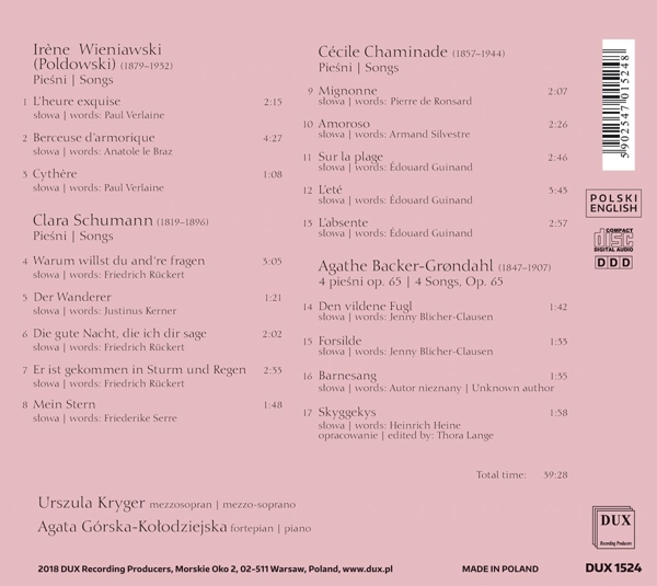 | Beschreibung: | One of the most respected Polish mezzosopranos, Urszula Kryger and outstanding pianist Agata Górska-Kolodziejska, present a number of songs by four female composers active throughout the 19th and 20th centuries: Irene Régine Wieniawski (pseudonym: Poldowski), Clara Schumann, Cécile Chaminade and Agathe Backer Grondahl. The material includes 17 carefully selected songs that allow the recipient to place the aforementioned works in the context of well-known pieces of the most representative 19th-century composers, commonly associated with vocal and instrumental lyrics. This album also makes us aware of the different stylistic influences of those composers, active in similar years, but coming from different cultural backgrounds., Labelcode DUX1524.2 |