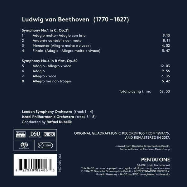 Beschreibung:Composed By: Ludwig van Beethoven, Conductor: Rafael Kubelik, Design: Joost De Boo, Edited By: Christa Conrad, Engineer [Balance]: Heinz Wildhagen, Engineer [Recording]: Hans-Rudolf Müller, Executive-Producer: Dr. Rudolf Werner, Liner Notes: Jörg Peter Urbach, Orchestra: Israel Philharmonic Orchestra, Orchestra: The London Symphony Orchestra, Producer [Recording]: Hans Weber, Product Manager: Max Tiel, Labelcode PNTA5186248SACD (PTC 5186 248), Phonographic Copyright (p) Deutsche Grammophon GmbH, Copyright (c) PentaTone Music B.V., Recorded At Brent Town Hall, Recorded At Herkulessaal, München, Remastered At Polyhymnia International, Glass Mastered At Arvato, Glass Mastered At Arvato