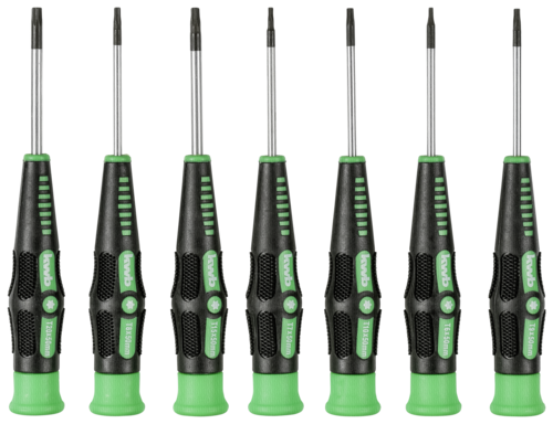 CV-Stahl, 2-Komponentenheft, mit Drehkopf für optimale Kraftübertragung und leichteres Arbeiten im Bereich der Feinmechanik, Klingen aus CV-Stahl, matt verchromt, mit brünierter Präzisionsspitze, in Kunststoffkassette Hauptmerkmale Technische Details Produkttyp Set Schraubendreher-Typ Präzisions-Schraubendreher Anzahl der Schraubendreher 7 Schraubendreher-Bits enthalten Torx Farbe Handgrifffarbe Schwarz/Grün
