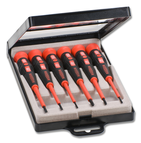 VDE gepru¨ft, CV-Stahl, 2-Komponentenheft, mit Drehkopf für optimale Kraftübertragung und leichteres Arbeiten im Bereich der Feinmechanik, Klingen vollisoliert, mit brünierter Präzisionsspitze, in Kunststoffkassette Hauptmerkmale Technische Details Produkttyp Set Schraubendreher-Typ Präzisions-Schraubendreher Anzahl der Schraubendreher 6 Schraubendreher-Bits enthalten Flach, Phillips Farbe Handgrifffarbe Schwarz/Orange