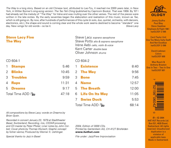 | Beschreibung: | Runningtime: 00:00:00, Alto Saxophone, Soprano Saxophone: Steve Potts, Cello, Violin, Voice: Irene Aebi, Design [Graphic Concept]: fuhrer vienna, Double Bass: Kent Carter, Drums: Oliver Johnson, Liner Notes: John Corbett, Photography By [Cover Photo By]: Thomas Wunsch, Producer: Werner X. Uehlinger, Recorded By [Recording By], Mixed By [Mix By], Mastered By [CEDAR procesing and CD Master By]: Peter Pfister, Soprano Saxophone, Liner Notes: Steve Lacy, Words By: Brion Gysin, Labelcode HAHT604.2 (hatOLOGY 2-604), Phonographic Copyright (p) Hat Hut Records Ltd., Copyright (c) Hat Hut Records Ltd., Pressed By SDC (3), Printed By Gantenbein AG, Recorded At Theater Basel |