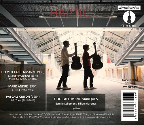 Beschreibung:The new CD Haptic by the French guitar duo Lallement Marques, two musicians internationallyrecognized for it's interpretations of the contemporary repertoire, presents a singular programthrough the compositions of three authors: Helmut Lachenmann, Mark Andre and Pascale Criton,a journey through the surprising sounds of music of our time. The publication opens with Salut furCaudwell by Helmut Lachenmann ((1935), a piece composed in 1977, with a performance by theDuo resulting from a long experience developed together with the composer. Characterized by apermanent tension, the score has become a reference work for the repertoire for two guitars, apiece by Lachenmann follows iv 14 by Mark Andre (1964), a piece of "intense fragility", terms inwhich, says Elisa Constable, "all the compositional challenges of Mark Andre's work, profoundlyoriented towards the search for an ineffable artistic and spiritual." This intense journey of listeningto the textures of different compositional languages ends with Trans, in five movements, by PascaleCriton (1954), an author who in his research he particularly explores the variability of sound andthe spatialization of listening., Labelcode STU37255.2