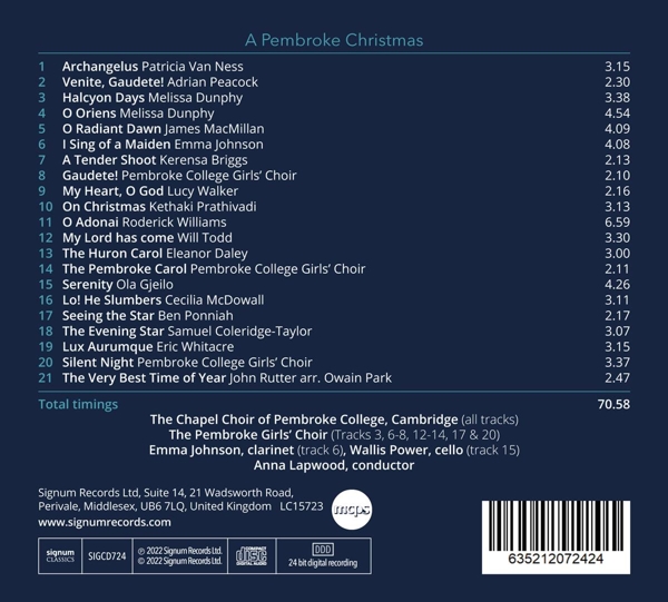The Nine Orders of the Angels 01. The Chapel Choir of Pembroke College, Cambridge "II. Archangelus" 02. The Chapel Choir of Pembroke College, Cambridge "Venite, Gaudete!" 03. The Chapel Choir of Pembroke College, Cambridge "Halcyon Days" 04. The Chapel Choir of Pembroke College, Cambridge "O Oriens" 05. The Chapel Choir of Pembroke College, Cambridge "O Radiant Dawn" 06. Emma Johnson "I Sing of a Maiden" 07. The Chapel Choir of Pembroke College, Cambridge "A Tender Shoot" 08. The Chapel Choir of Pembroke College, Cambridge "Gaudete" 09. The Chapel Choir of Pembroke College, Cambridge "My Heart, O God" 10. The Chapel Choir of Pembroke College, Cambridge "On Christmas" 11. The Chapel Choir of Pembroke College, Cambridge "O Adonai" 12. The Chapel Choir of Pembroke College, Cambridge "My Lord has come" 13. The Chapel Choir of Pembroke College, Cambridge "The Huron Carol" 14. The Chapel Choir of Pembroke College, Cambridge "The Pembroke Carol" 15. Wallis Power "Serenity" 16. The Chapel Choir of Pembroke College, Cambridge "Lo! He Slumbers" 17. The Chapel Choir of Pembroke College, Cambridge "Seeing the Star" 18. The Chapel Choir of Pembroke College, Cambridge "The Evening Star" 19. The Chapel Choir of Pembroke College, Cambridge "Lux Aurumque" 20. The Chapel Choir of Pembroke College, Cambridge "Silent Night" 21. The Chapel Choir of Pembroke College, Cambridge "The Very Best Time of Year"