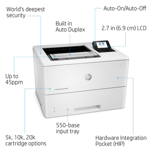 Verpackungsdaten | | Verpackungsbreite | 497 mm | | Verpackungstiefe | 398 mm | | Verpackungshöhe | 466 mm | | Paketgewicht | 14,3 kg | Technische Details | | Versandkarton pro Palettenlage | 6 Stück(e) | | Konformitätsbescheinigungen | CECP | | URL der allgemeinen Produktsicherheitsverordnung (GPSR) | https://support.hp.com/gb-en/product/setup-user-guides/hp-laserjet-enterprise-m507-series/model/19203856?sku=1PV87A&serialnumber=1PV87A ; https://h10032.www1.hp.com/ctg/Manual/c06187694.pdf | Systemanforderung | | Unterstützt Windows-Betriebssysteme | Windows 7 Enterprise, Windows 7 Ultimate, Windows 7 Professional, Windows 7 Starter, Windows 7, Windows 8 Pro, Windows 8 Enterprise, Windows 8, Windows 8.1 Pro, Windows 8.1 Enterprise, Windows 8.1, Windows 10 Pro, Windows 10 Enterprise, Windows 10 | | Unterstützt Mac-Betriebssysteme | Mac OS X 10.12 Sierra, Mac OS X 10.13 High Sierra, Mac OS X 10.14 Mojave, MacOS | | Unterstützte Linux-Betriebssysteme | Ja | | Unterstützung anderer Betriebsysteme | iOS, Android | Sonstige Funktionen | | Empfohlene Systemvoraussetzungen | 2 GB available hard disk space, Internet connection, USB port, Internet browser. | | Elektromagnetische Verträglichkeit | CISPR 22:2008 (International) - Class A, CISPR32:2012 (International) - Class A, EN 55032:2012 (EU) - Class A, EN 61000-3-2:2014, EN 61000-3-3:2013, EN 55024:2010, EMC Directive 2014/30/EU, Issue 6 Class A. Other EMC approvals as required by individual countries. | | Kompatible Betriebssysteme | Windows Client OS (32/64 bit), Win10, Win8.1, Win 8 Basic, Win8 Pro, Win8 Enterprise, Win8 Enterprise N, Win7 Starter Edition SP1, UPD Win7 Ultimate, Mobile OS, iOS, Android, Mac, Apple macOS Sierra v10.12, Apple macOS High Sierra v10.13, Apple macOS Mojave v10.14, Discrete PCL6 Printer Driver, For more information on the supported operating systems go to http://support.hp.com, Enter your product name and search, Click on User Guides and enter your product name and search for User Guide, Search for your (Product Name) - User Guide, Search for the Supported Operating Systems section, UPD PCL6 / PS Printer Drivers, Supported Operating systems, For more information on the supported operating systems see http://www.hp.com/go/upd | | Drucken | Monodruck | | Prozessor-Taktfrequenz | 1,2 GHz | | Herstellergarantie | 1 Jahr Garantie mit Vor-Ort-Service am nächsten Arbeitstag. Die genauen Garantie-/Supportoptionen können je nach Produkt, Land und landesspezifischer Gesetzgebung variieren. | | Empfohlener Luftfeuchtigkeitsbereich | 30 - 70 % | | Empfohlener Betriebstemperaturbereich | 15 - 27 °C | | Kundenspezifische Mediengrößen | Tray 1: 76.2 x 127 to 215.9 x 355.6 mm; Tray 2: 105 x 148 to 215.9 x 355.6 mm; Optional 550 sheet Tray: 105 x 148 to 215.9 x 355.6 mm | | Zufuhrfach für Briefumschläge | Nein | | Geräuschemission (betriebsbereit) | 39 dB | | Emissionsschalldruckpegel Bystander-Position (betriebsbereit) | 25 dB | | Typischer Stromverbrauch (TEC) – Nummer | Blue Angel: 1.257 kWh/Week; Energy Star 3.0: 0.420 kWh/Week | | UNSPSC-Code | 43212105 | | Packungsinhalt | HP LaserJet Enterprise M507dn Printer; HP Original LaserJet Toner Cartridge (5,000 pages); Regulatory flyer (CD replacement); Unpack flyer; Installation guide; Power cord; Warranty cards; Support flyers/number list | Papierhandhabung | | Maximale Papiergröße der ISO A-Serie | A4 | | Medientypen für das Papierfach | Normales Papier, Bondpapier, Recyclingpapier, Briefumschläge, Kartenstapel, Etiketten, Transparenzen, Konzeptpapier | | ISO-A-Formate (A0...A9) | A4, A5, A6 | | ISO-B-Formate | B5 | | ISO C-Seriengrößen (C0...C9) | C5, C6 | | Nicht-ISO Druckmedienformate | Oficio, 16K | | JIS B-Seriengröße (B0...B9) | B5, B6 | | Umschlaggrößen | B5, C5, C6, DL | | Fotopapiergrößen | 10x15 cm | | Benutzerdefinierte Medienbreite | 76,2 - 215,9 mm | | Benutzerdefinierte Medienlänge | 127 - 355,6 mm | | Mediengewichte für das Papierfach | 60 - 200 g/m² | Netzwerk | | W-LAN | Ja | | Ethernet/LAN | Ja | | Netzwerkfähig | Ja | | Ethernet LAN Datentransferraten | 1000 Mbit/s | | Bluetooth | Ja | | Unterstützte Sicherheitsalgorithmen | SNMPv3, SSL/TLS, EAP-PEAP, EAP-TLS, FIPS 140, HTTPS, IPSec | | Mobile Drucktechnologien | Mopria Print Service, HP ePrint, Apple AirPrint, Google Cloud Print | Nachhaltigkeit | | Nachhaltigkeitszertifikate | ENERGY STAR, Blue Angel | | Nachhaltige Technologien und Materialien | Quecksilberfrei | | Enthält nicht | Quecksilber | | Nachhaltigkeitskonformität | Ja | Merkmale | | Maximale monatliche Auslastung | 150000 Seiten pro Monat | | Druckfarben | Schwarz | | Zahl der Druckpatronen | 1 | | Seitenbeschreibungssprachen | PostScript 3, PDF 1.7, PCL 6 | | Empfohlene monatliche Auslastung | 2000 - 7500 Seiten pro Monat | | Drucker-Schriftarten | Scalable, TrueType, Windows, PCL, PostScript | | Ursprungsland | Brasilien, Japan, Philippinen | | Ersatzpatronen | CF289A HP 89A Schwarz Original LaserJet Tonerkartusche (5.000 Seiten);CF289X HP 89X Schwarz Original LaserJet Tonerkartusche mit hoher Reichweite (10.000 Seiten); CF289Y HP 89Y Schwarz Original LaserJet Tonerkartusche mit extrahoher Reichweite (20.000 Seiten) | | HP-Segment | Business | Markeneigenschaften | | HP ePrint | Ja | | HP Auto-On/Auto-Off | Ja | | HP dynamische Sicherheit | Ja | | HP Security-Tools | Identity management: Kerberos authentication; LDAP authentication; 1000 user PIN codes; Optional HP and 3rd party advanced authentication solutions (e.g.: badge readers); Network: IPsec/firewall with Certificate; Pre-Shared Key and Kerberos authentication; Supports WJA-10 IPsec configuration Plug-in; 802.1X authentication (EAP-PEAP; EAP-TLS); SNMPv3; HTTPS; Certificates; Access Control List; Data: Storage Encryption; Encrypted PDF & Email (uses FIPS 140 validated cryptographic libraries from Microsoft); Secure Erase; SSL/TLS (HTTPS); Encrypted Credentials; Device: Security lock slot; USB port disablement; Hardware integration pocket for security s