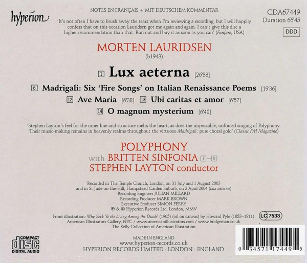 Beschreibung:Runningtime: 00:00:00, Choir: Polyphony, Composed By: Morten Lauridsen, Conductor: Stephen Layton, Engineer [Recording Engineer]: Julian Millard, Executive-Producer: Simon Perry (5), Illustration [Front Illustration]: Howard Pyle (3), Leader: Pauline Lowbury, Liner Notes: Byron Adams, Liner Notes [Traduction]: Hyperion (16), Liner Notes [Übersetzung]: Viola Scheffel, Orchestra: Britten Sinfonia, Producer [Recording Producer]: Mark Brown (4), Labelcode CDA67449, Phonographic Copyright (p) Hyperion Records Limited, Copyright (c) Hyperion Records Limited, Recorded At Temple Church, London, Recorded At Church Of St. Jude-on-the-Hill, Hampstead