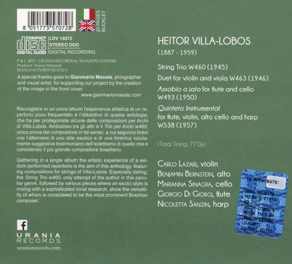 String Trio W460 01. "1. Allegro" 02. "2. Andante" 03. "3. Scherzo (Vivace)" 04. "4. Allegro preciso e agitato" Duet for Violin and Viola W463 05. "1. Allegro" 06. "2. Adagio" 07. "3. Allegro agitato" Assobio A Jato for Flute and Cello W493 08. "1. Allegro non troppo" 09. "2. Adagio" 10. "3. Vivo" Quinteto Instrumental for Flute, Violin, Viola, Cello and Harp 11. "1. Allegro non troppo" 12. "2. Lento" 13. "3. Allegro poco moderato"
