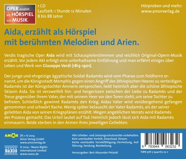 Aida (Oper in 4 Akten) (Auszug) 01. National Symphony Orchestra Of Ireland "Preludio" 02. Zamperoni, Luca "Einführung mit Luca Zamperoni" Aida (Oper in 4 Akten) (Auszug) 03. National Symphony Orchestra Of Ireland "Triumphmarsch (Orchesterzwischenspiel)" 04. Hof, Thomas "Erz?hler" Aida (Oper in 4 Akten) (Auszug) 05. National Symphony Orchestra Of Ireland "Nume, custode e vindice" 06. Hof, Thomas "Erz?hler" Aida (Oper in 4 Akten) (Auszug) 07. National Symphony Orchestra Of Ireland "Celeste Aida" 08. Hof, Thomas "Szene 1: Amneris, Radam?s, Aida - Radam?s' und Aidas gemeinsame..," Aida (Oper in 4 Akten) (Auszug) 09. National Symphony Orchestra Of Ireland "Auftritt des K?nigs (Orchesterzwischenspiel)" 10. Hof, Thomas "Szene 2: K?nig, Aida, Radam?s, Amneris, Chor - Der Pharao betritt..." Aida (Oper in 4 Akten) (Auszug) 11. Dever, Barbara "Sul del Nilo al sacro lido" 12. Hof, Thomas "Szene 3: Aida. W?hrend die Vertreter" Aida (Oper in 4 Akten) (Auszug) 13. National Symphony Orchestra Of Ireland "I sacri nomi di padre" 14. Hof, Thomas "Einführung 2. Akt" Aida (Oper in 4 Akten) (Auszug) 15. National Symphony Orchestra Of Ireland "Chi mai fra g'linni e i plausi" 16. Hof, Thomas "Szene 4: Amneris, Aida - Ach, Aida" Aida (Oper in 4 Akten) (Auszug) 17. National Symphony Orchestra Of Ireland "Marsch (Orchesterzwischenspiel)" 18. Hof, Thomas "Szene 5: K?nig Radam?s, Aida Amonasro - Radam?s?" Aida (Oper in 4 Akten) (Auszug) 19. National Symphony Orchestra Of Ireland "Gloria all'Egitto" 20. Hof, Thomas "Einführung 3. Akt" Aida (Oper in 4 Akten) (Auszug) 21. National Symphony Orchestra Of Ireland "Qui Radam?s verr?!" 22. Hof, Thomas "Szene 6: Aida, Amonasro - Aida wartet also..." Aida (Oper in 4 Akten) (Auszug) 23. National Symphony Orchestra Of Ireland "Ah! Piet?, piet?!" 24. Hof, Thomas "Szene 7: Radam?s, Aida, Amonasro - K?nig Amonasro" Aida (Oper in 4 Akten) (Auszug) 25. National Symphony Orchestra Of Ireland "Traditor!" 26. Hof, Thomas "Einführung 4. Akt" Aida (Oper in 4 Akten) (Auszug) 27. National Symphony Orchestra Of Ireland "L'aborrtia rivale" 28. Hof, Thomas "Szene 7: Amneris, Ramphis - Radam?s hat..." Aida (Oper in 4 Akten) (Auszug) 29. National Symphony Orchestra Of Ireland "La fatal pietra" 30. Hof, Thomas "Epilog" Aida (Oper in 4 Akten) (Auszug) 31. National Symphony Orchestra Of Ireland "Immenso Fth?" Aida (Oper in 4 Akten) (Auszug) 32. National Symphony Orchestra Of Ireland "O terra, addio"