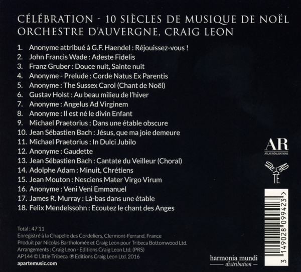 01. "R?jouissez-vous!" 02. "Adeste Fideles" 03. "Douce nuit, sainte nuit (Stille Nacht, heilige Nacht)" 04. "Pr?ludium: Corde natus ex parentis" 05. "The Sussex Carol (Chant de No?l)" 06. "Au beau milieu de l'hiver" 07. "Angelus ad virginem" 08. "Il est n? le divin enfant" 09. "Dans une ?table obscure" 10. "J?sus, que ma joie demeure" 11. "In dulci jubilo" 12. "Gaudette" 13. "Cantate du veilleur (Choral)" 14. "Minuit Chr?tiens (O Holy Night) (Cantique No?l)" 15. "Nesciens mater virgo virum" 16. "Veni veni Emmanuel" 17. "L?-bas dans une ?table" 18. "Ecoutez le chant des Anges"