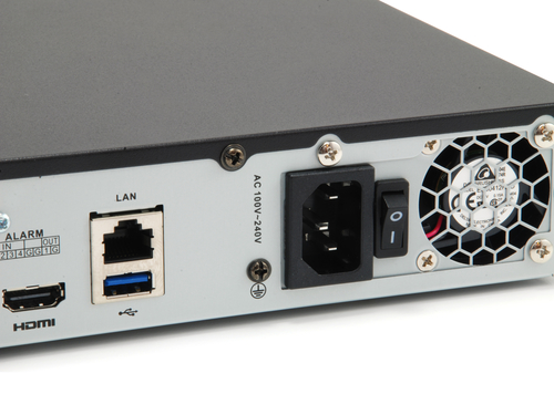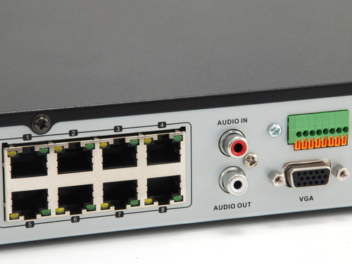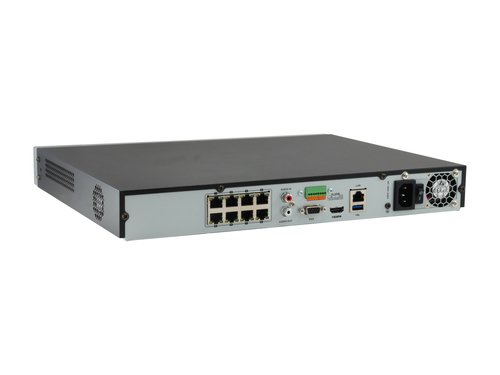 Anschlüsse: 8x 10/100 MBit/s (PoE),1x Audio out, 1x Audio in, 1x HDMI, 2x USB 3.0, 1x VGA, DI/DO, 10/100/1000 MBit/s Netwerk interface