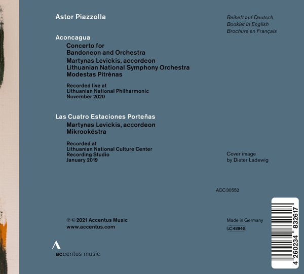 Beschreibung:The accordion is an instrument that is deeply rooted in Lithuanian folk music. Today, the accordion is also recognized as a versatile instrument of classical music, a change in perception that has largely been promoted by Martynas Levickis, one of the most internationally sought-after musicians in his field. With it's lightness and melancholy, Astor Piazzolla's music has fascinated the young accordionist from an early age, and so it goes without saying that he is dedicating himself to this exceptional composer in his anniversary year. Together with the Lithuanian National Symphony Orchestra he recorded "Aconcagua" live in concert. For conductor Modestas Pitrenas, Piazzolla's concerto - named posthumously after the highest mountain in the Americas - "conveys the climb to the roof of the earth in all it's facets and symbolism: freedom, longing, loneliness, pain, transfiguration, peace." Levickis has a long and close collaboration with the chamber orchestra "Mikroórkestra". Together they present their interpretation of "Las Cuatro Estaciones Portenas," Piazzolla's timeless masterpieces of many styles that capture in music the four seasons in Argentina's capital Buenos Aires., Runningtime: 00:00:00, Accordion: Martynas Levickis, Conductor: Modestas Pitr?nas, Orchestra: Lithuanian National Symphony Orchestra, Written-By: Astor Piazzolla, Labelcode ACCT30552.2 (ACC30552), Recorded At Lithuanian National Philharmonic Hall, Recorded At Lithuanian National Culture Centre Recording Studio
